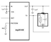 Drawing: The bq25100, which measures just 0.9 x 1.6 mm, can implement a single-cell linear charger design in 2.8 mm x 4.1 mm of board space, which is said to be half the size of existing solutions.