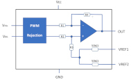 Diagram: The high-precision current sense amplifier with enhanced PWM rejection can sense current via a shunt resistor over a wide range of common-mode voltages, from -4 V to +100 V, regardless of the supply voltage. It is also AEC-Q100 qualified.